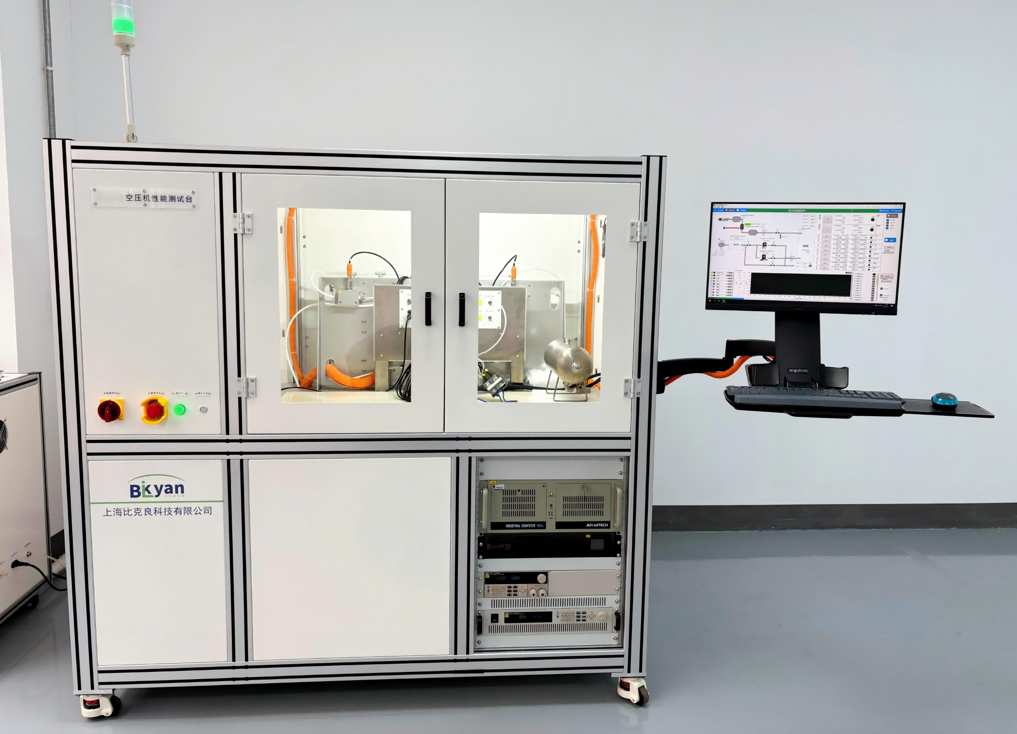 汽车空气悬架空压机性能测试系统,主要对汽车空气悬架系统部件中的空压机、分配阀的性能进行性能及耐久测试。测试项目主要包括:1、充气和泄压试验(可模拟海拔高度);2、泄漏测试;3、浪涌电流测试;4、升降温测试;5、热冲击测试;6、RAPA响应测试等。